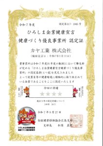 ( 弊社がひろしま企業健康宣言証を交付された時の記事はこちら ⇒ 「ひろしま企業健康宣言」社員の健康促進に一層取り組みます! )