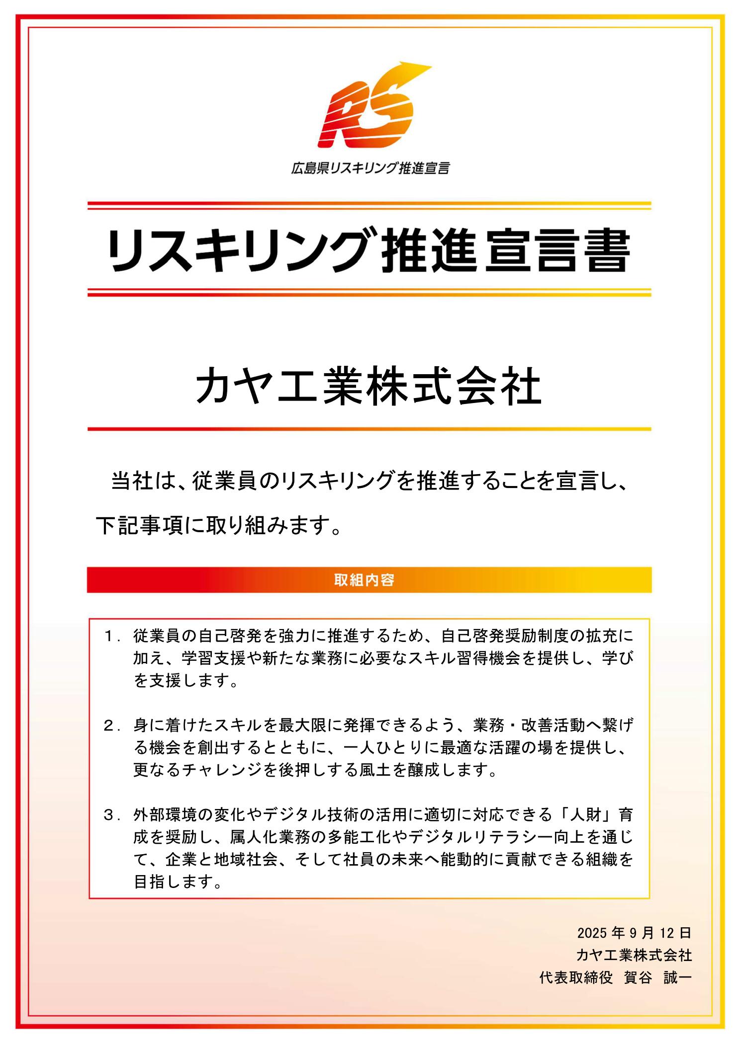 カヤ工業㈱では、デジタル化が急速に進む社会環境変化の対応、また従業員の自己啓発に対する支援拡充を目的とし、広島県リスキング推進宣言を行います。