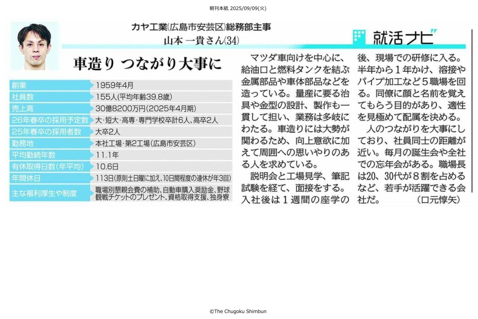 2025年9月9日の中国新聞(朝刊9面)「就活ナビ欄」にて、当社人事担当のインタビューが掲載されました。
