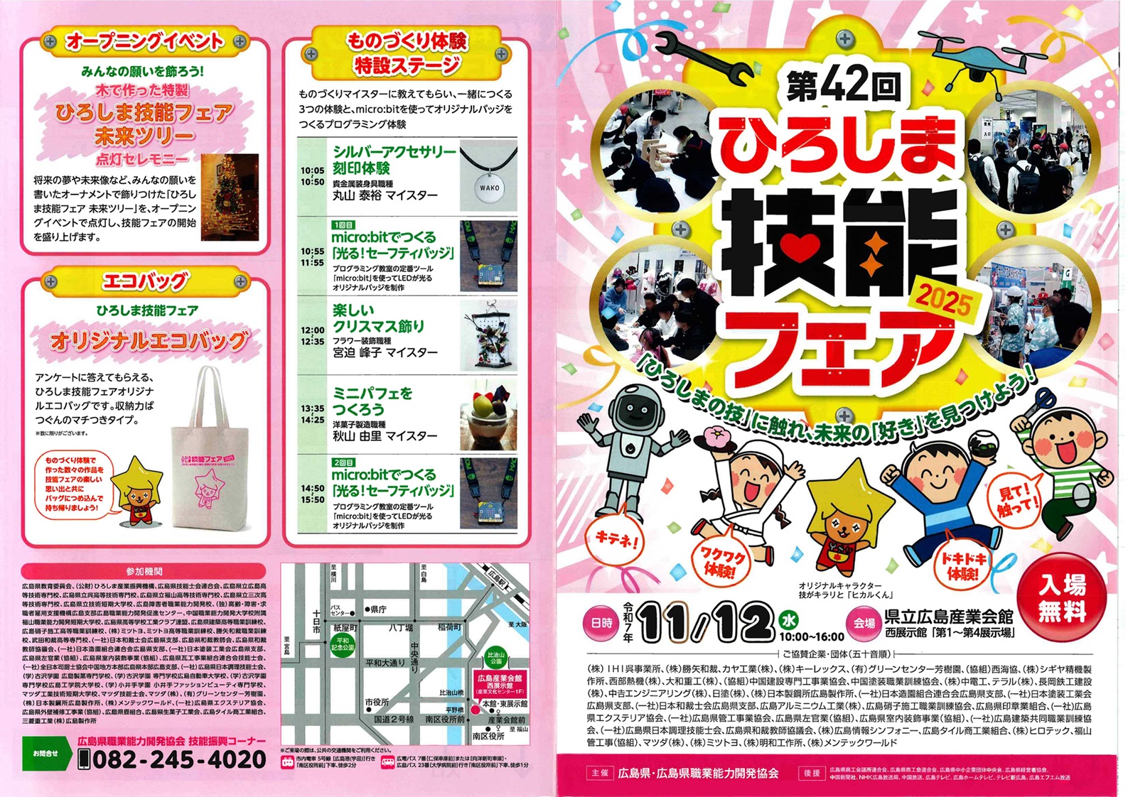 2025-11-10 [お知らせ]第42回ひろしま技能フェア開催(11月12日) 今年で第42回を迎える「ひろしま技能フェア」に、弊社も去年同様協賛しております。 技能フェアではものづくりの体験ができ、この体験を通じて”ものづくりの面白さ”を体感していただけるのではないかと考えております🍀 ぜひ、皆様も足を運んでみてください💁♀️ 「第42回 ひろしま技能フェア2025」 日時:2025年11月12日(水)10:00~16:00 場所:県立広島産業会館 西展示館(第1~第4展示場)