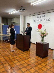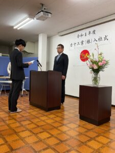 式典では社長から歓迎の挨拶があり新入社員から誓いの言葉、また昨年度入社した先輩社員からの歓迎の言葉がありました。