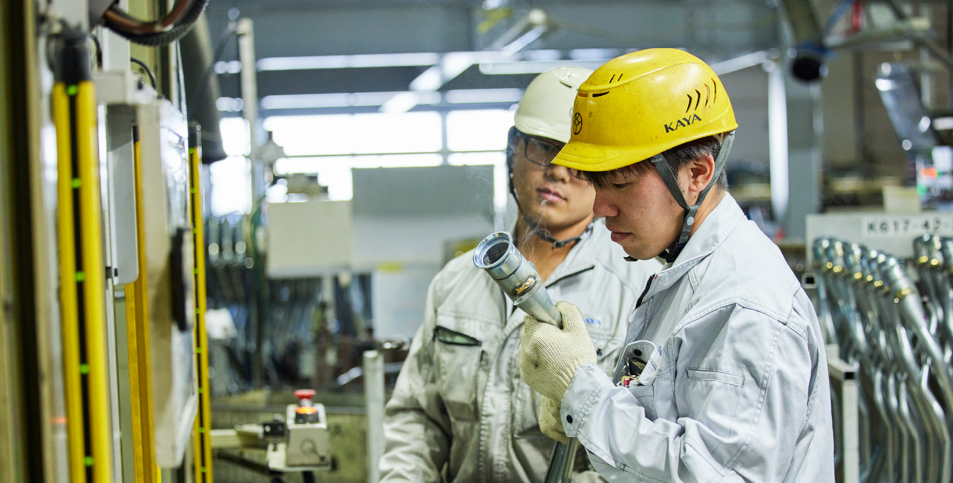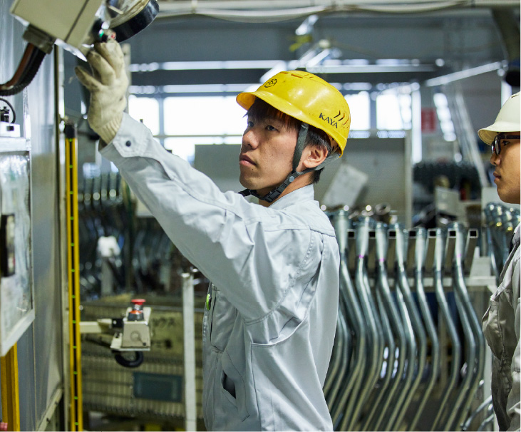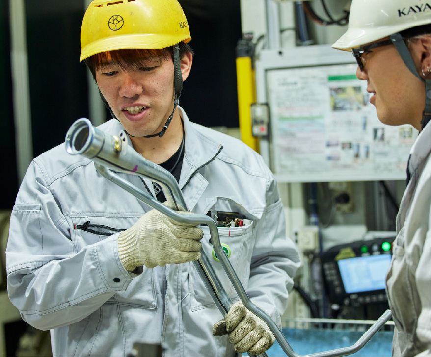 カヤ工業では、プレス加工・溶接・組立・パイプ加工などの様々な加工技術が経験出来るので、自身のスキルや知識として身に付ける事ができます。
